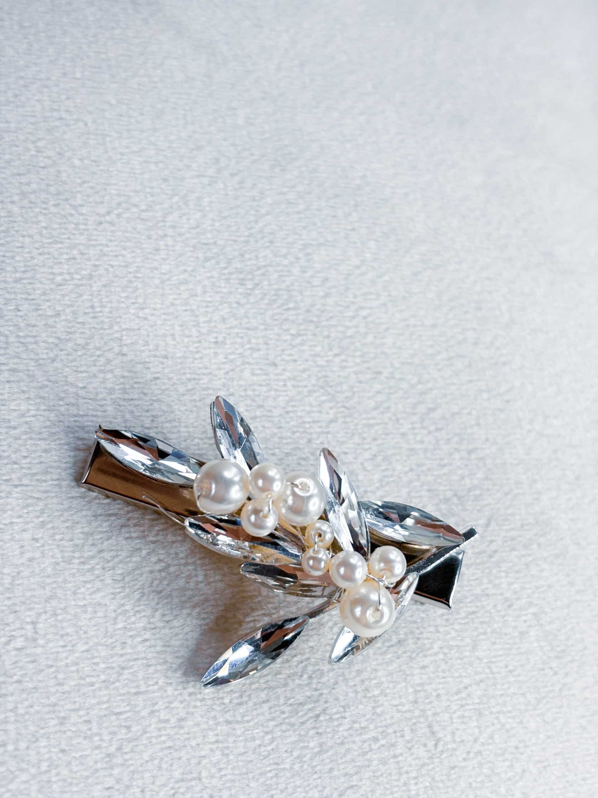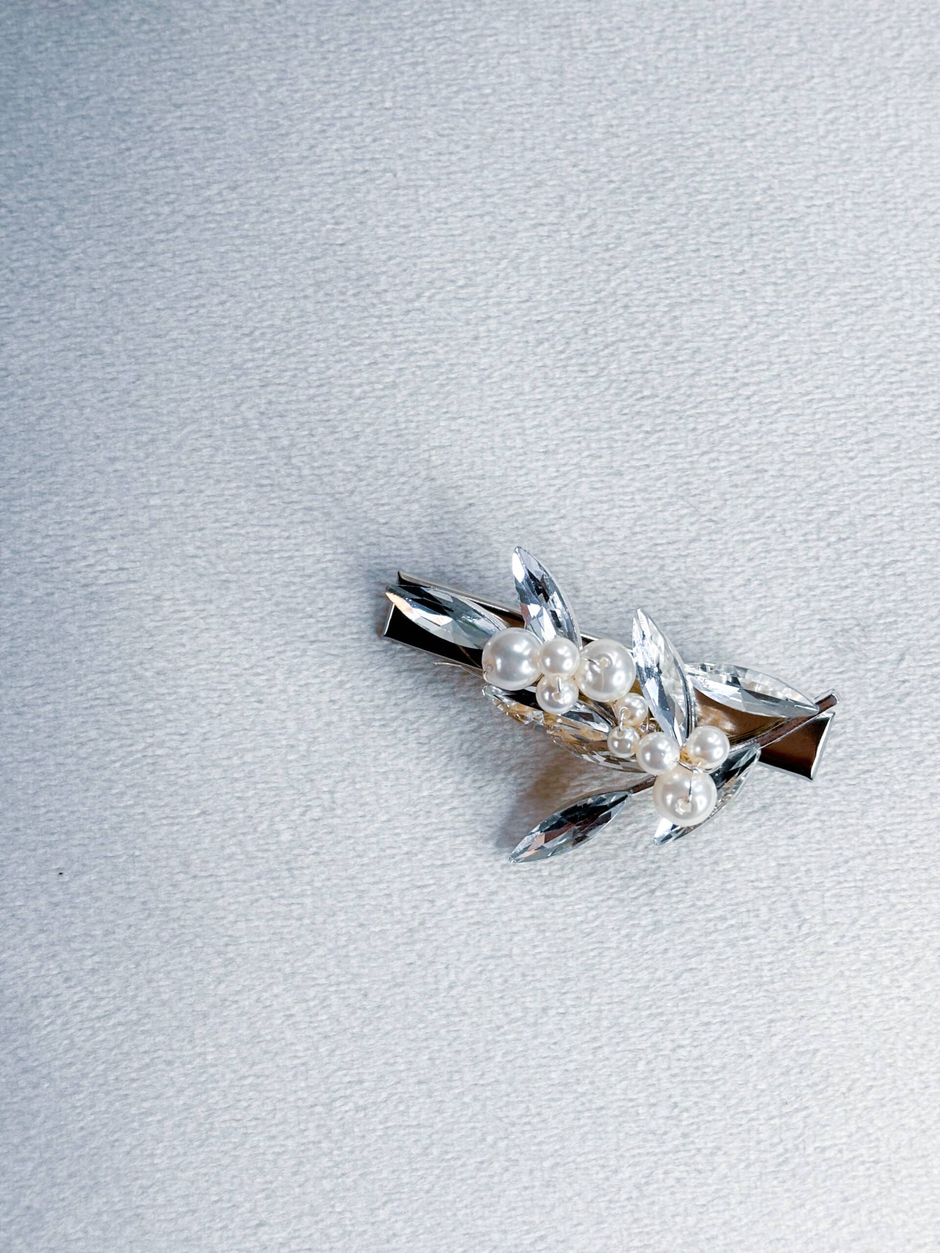 La barrette mariage Irma est composée de cristaux et de perles nacrées montés sur une pince crocodile. Cette barrette est disponible en finition dorée ou argentée. Le support peut être modifié sur demande.